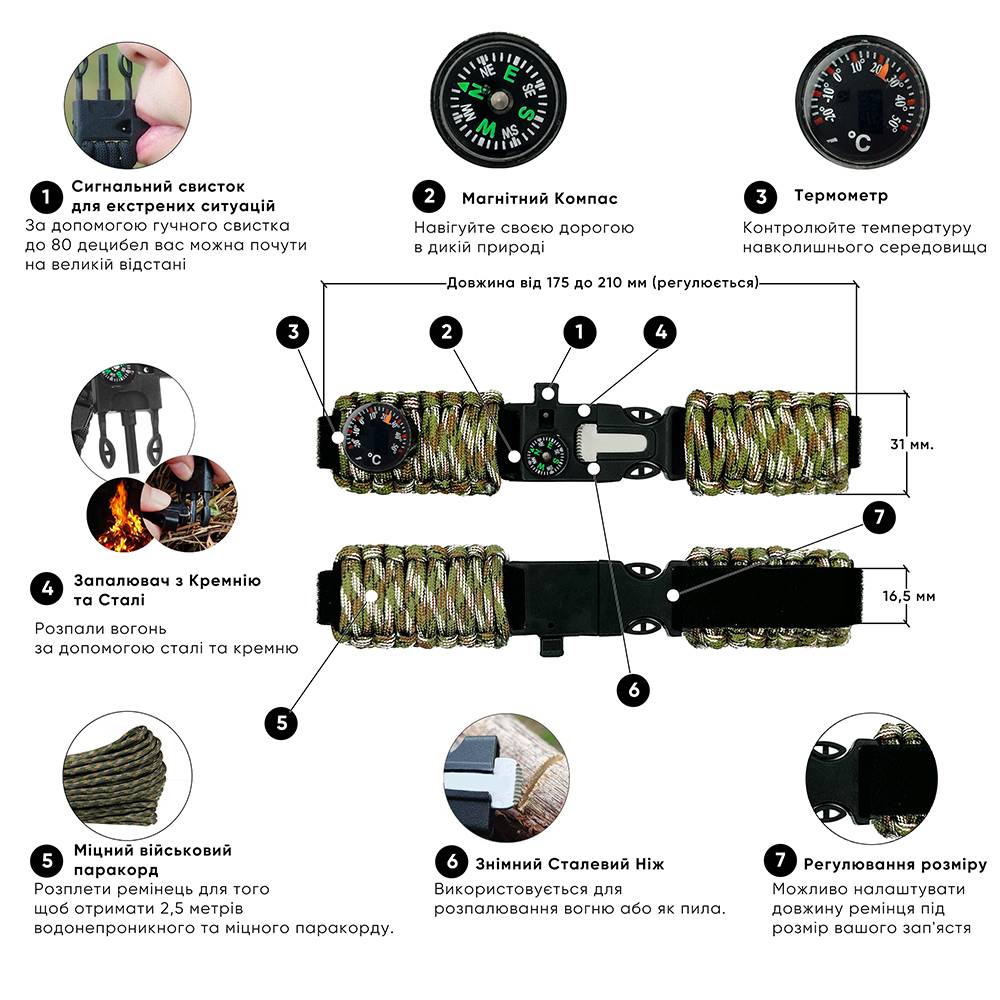 Ремешок паракордовый многофункциональный Khaki от бренда Patriot – это стильный и практичный аксессуар, выполненный в черном и хаки цветах. , ширина – 17 см, вес – 35 г. Застежка черного цвета обеспечивает надежную фиксацию. Гарантия на товар – 1 месяц.