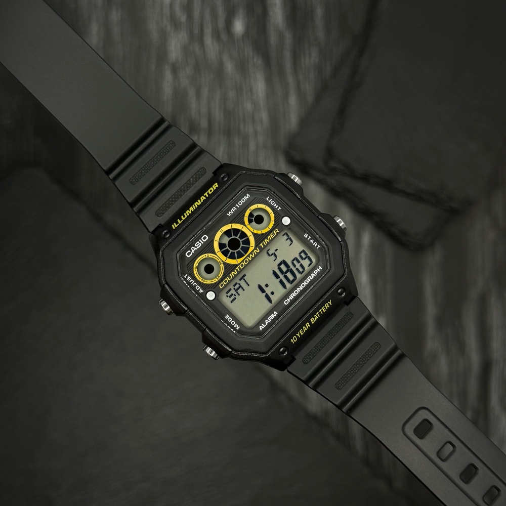 Представляємо вам стильний спортивний годинник Casio AE-1300WH-1A, створений для активних чоловіків. Цей надійний аксесуар виготовлено з міцного полімеру, що забезпечує йому відмінну стійкість та легкість - всього 65 г. Чорний квадратний корпус розміром 45 х 42 мм, обладнаний електронним циферблатом, доповнений яскравою електролюминесцентною підсвіткою, що робить його зручним для використання в темряві.