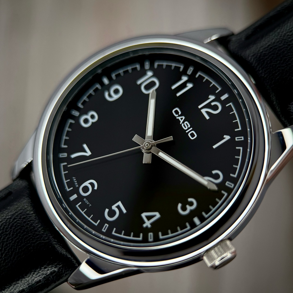 Модель обладнана чорним шкіряним ремінцем, що додає елегантності. Циферблат з арабськими цифрами легко читається завдяки світловому підсвічуванню, а класична кругла форма корпусу з сріблястим покриттям підкреслює його стильний вигляд. Годинник також має функцію індикації годин, хвилин і секунд, а міцне мінеральне скло захищає від подряпин.