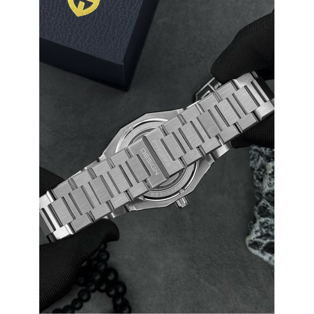 Pagani Design PD-1673 Silver-Black — це наручний годинник для чоловіків, які цінують поєднання класичного дизайну та надійної механічної конструкції. Модель виглядає стримано та елегантно, що робить її доречною як для повсякденного носіння, так і для більш зібраних образів, наприклад, ділових чи smart-casual. Годинник оснащений механізмом з автопідзаводом, що забезпечує стабільну роботу без батарейки, а чітка аналогова індикація дозволяє легко контролювати час і дату. Така конструкція робить модель зручною у щоденному використанні, підтримуючи функціональність без зайвих складнощів.