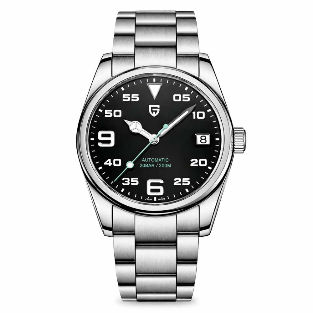 Годинник Pagani Design PD-1692 Silver-Black-Green — це стильний чоловічий аксесуар, що поєднує елегантність та функціональність. Має водонепроникність до 200 м, що робить його ідеальним для активного способу життя. Корпус і ремінець виготовлені з нержавіючої сталі, забезпечуючи надійність і довговічність. Сапфірове скло захищає циферблат, який має стрілочну індикацію часу, а також люмінесцентну підсвітку для зручності використання в темряві. Годинник обладнаний механічним механізмом з автопідзаводом, що гарантує точність і надійність. Діаметр корпусу складає 40 мм, а ширина ремінця — 20 мм. Сучасний класичний дизайн робить його універсальним для будь-якого стилю. Гарантія 12 місяців додає впевненості у покупці.