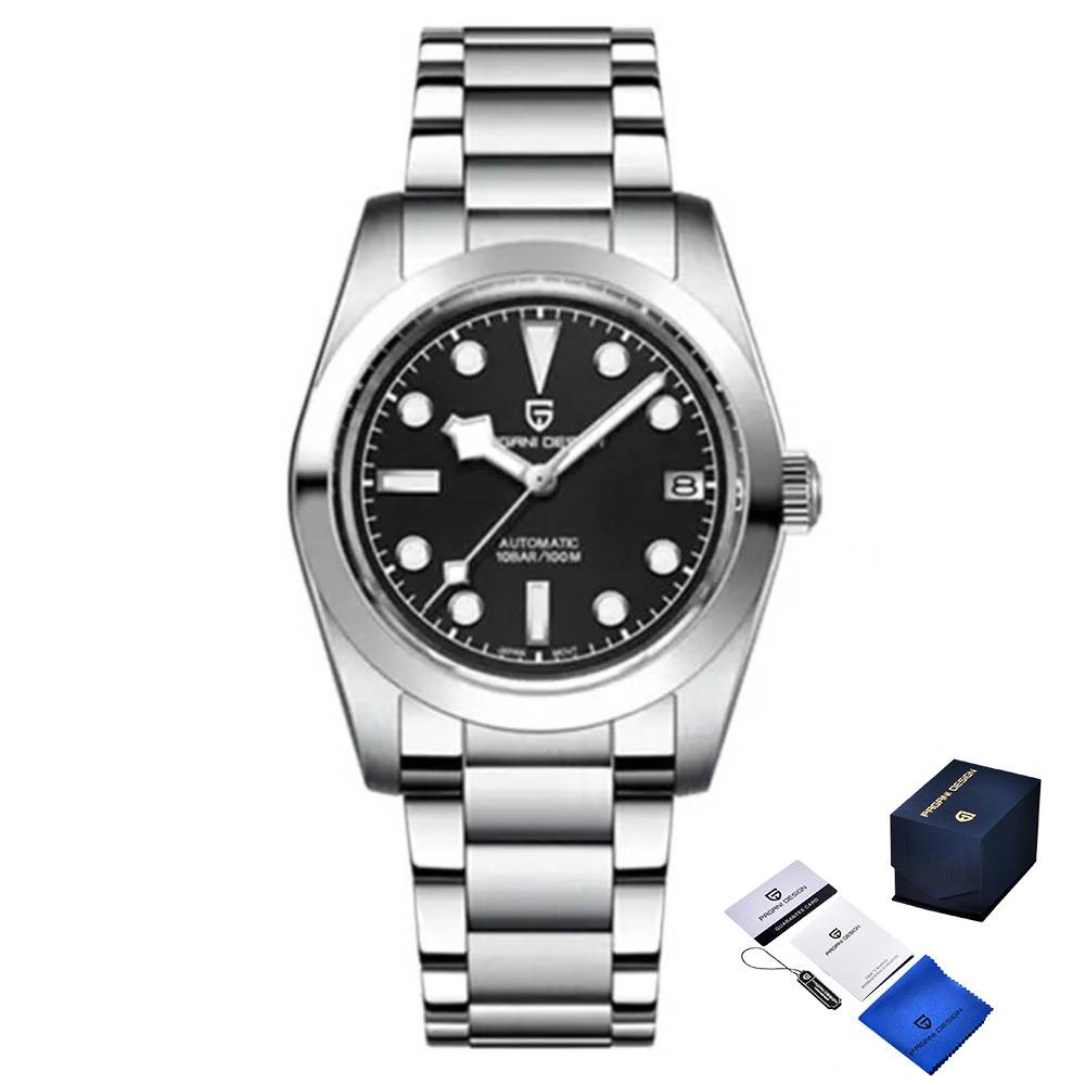 Годинник Pagani Design PD-1716 Silver-Black - стильний чоловічий аксесуар, що поєднує в собі елегантність і функціональність. Корпус і ремінець годинника виготовлені з нержавійної сталі, що забезпечує довговічність та стійкість до корозії. Сапфірове скло захищає циферблат від подряпин, а водонепроникність до 100 м дозволяє носити його під час плавання. Годинник оснащений механічним механізмом з автопідзаводом та функцією календаря. Люмінесцентна підсвітка забезпечує зручність у темряві, а стильний сріблястий колір робить його універсальним для будь-якого образу. Гарантія на товар - 12 місяців. Розміри корпусу 36,5 х 36,5 мм, вага - 143 г.