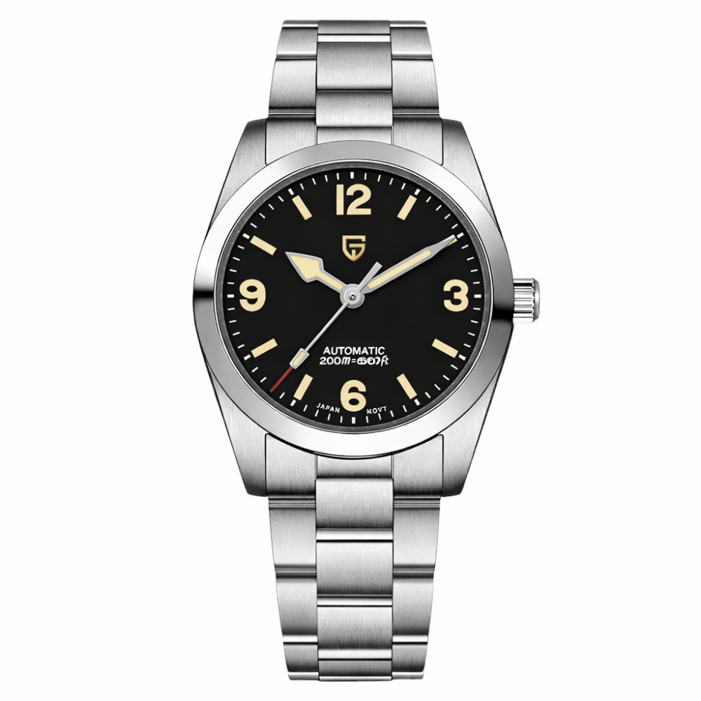 Чоловічий годинник Pagani Design PD-1751 Silver-Black поєднує в собі стиль і функціональність. Корпус виготовлений з нержавіючої сталі, що забезпечує його міцність та водонепроникність до 200 метрів. Сапфірове скло надійно захищає циферблат, на якому розташовані стрілки та арабські цифри для зручності читання часу. Годинник має механічний механізм з автопідзаводом і класичний круглий дизайн. Люмінесцентна підсвітка дозволяє зручно користуватись годинником у темряві. Довжина ремінця складає 21 см, ширина - 20 см. Сріблястий корпус і браслет надають модний вигляд, а 12-місячна гарантія підтверджує якість бренду Pagani Design.