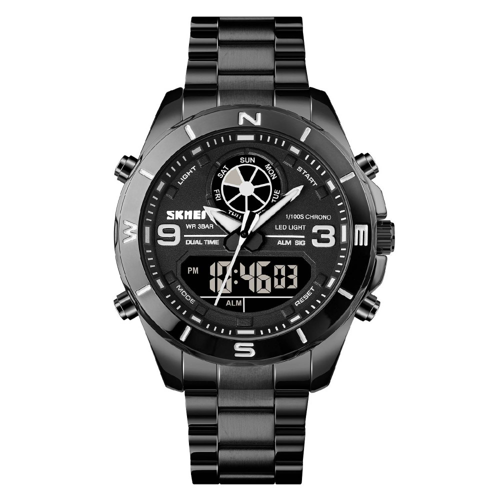 Skmei 1839BK оснащений кварцовим механізмом та стрілочно-електронним циферблатом, який відображає години, хвилини, секунди, день тижня та число. Додаткові функції включають будильник, календар, секундомір та другий часовий пояс. Годинник легко регулюється завдяки браслету з довжиною 23 см та шириною 20 см.