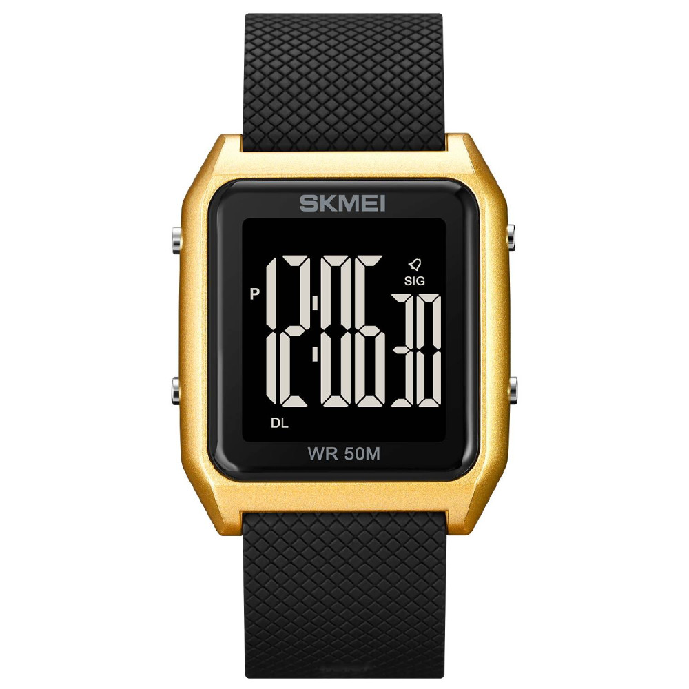 Корпус виготовлений з полімеру золотистого кольору, а чорний каучуковий ремінець забезпечує зручність носіння. Завдяки приямокому прямокутному дизайну та електролюмінесцентній підсвітці, цей годинник буде яскравим доповненням до вашого стилю.