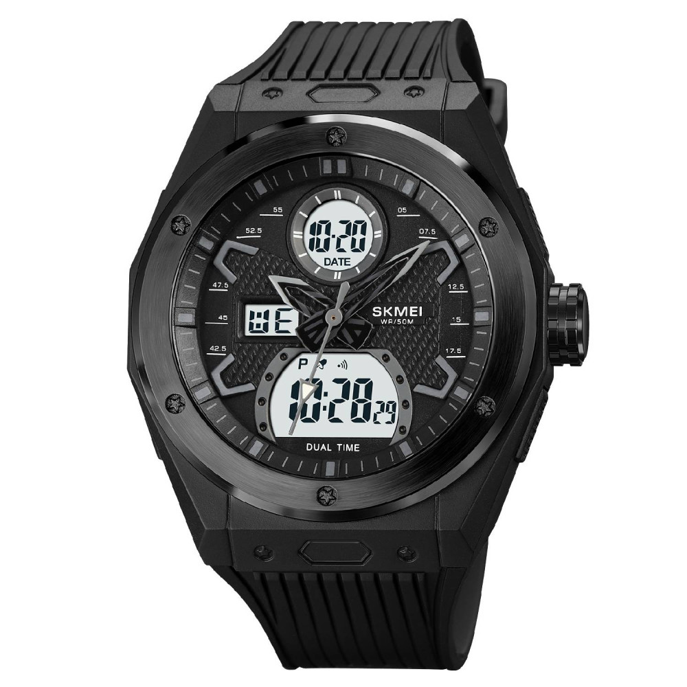Годинник Skmei 2013BKWT Black-White — це ідеальне поєднання стилю та функціональності. Спортивний та casual дизайн підходить для будь-якого випадку. Водонепроникність до 50 м дозволяє носити годинник під час активного відпочинку. Корпус виготовлений з полімеру, ремінець з каучуку, що забезпечує комфорт і надійність. Годинник має кварцовий механізм та комбінований стрілочно-електронний циферблат з індикацією годин, хвилин, секунд і дати. Функції: будильник, календар, другий часовий пояс та секундомір. Електролюмінесцентна підсвітка стає в нагоді у темряві. Розміри 53 х 46 мм, вага 59 г. Гарантія 12 місяців. Виробник — Китай.