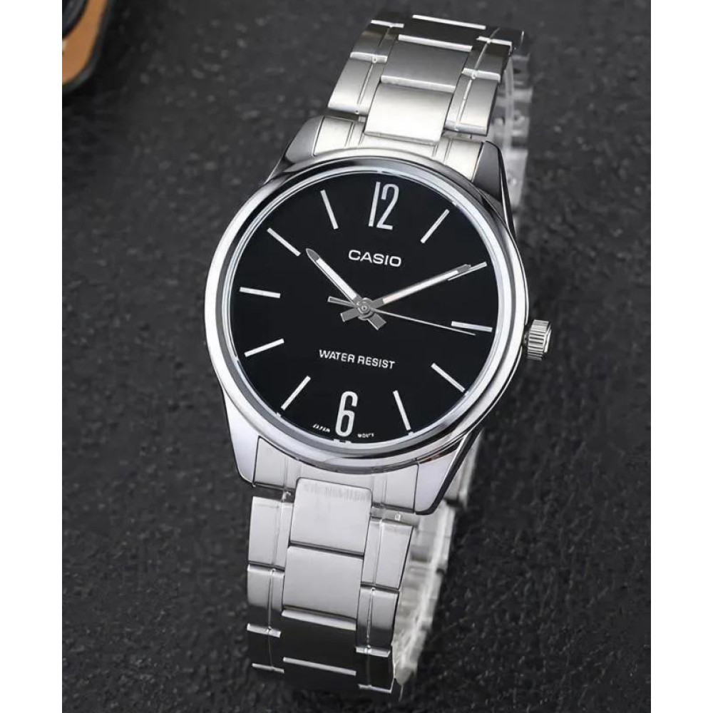 Casio MTP-V005D-1B вирізняється класичним дизайном із темним циферблатом і металевим корпусом з браслетом. Така конструкція забезпечує чітке зчитування часу й універсальну естетику без зайвих декоративних елементів. Металевий браслет фіксує годинник на зап’ясті та забезпечує комфорт протягом дня. Завдяки стриманому вигляду модель легко поєднується з повсякденним і діловим одягом.