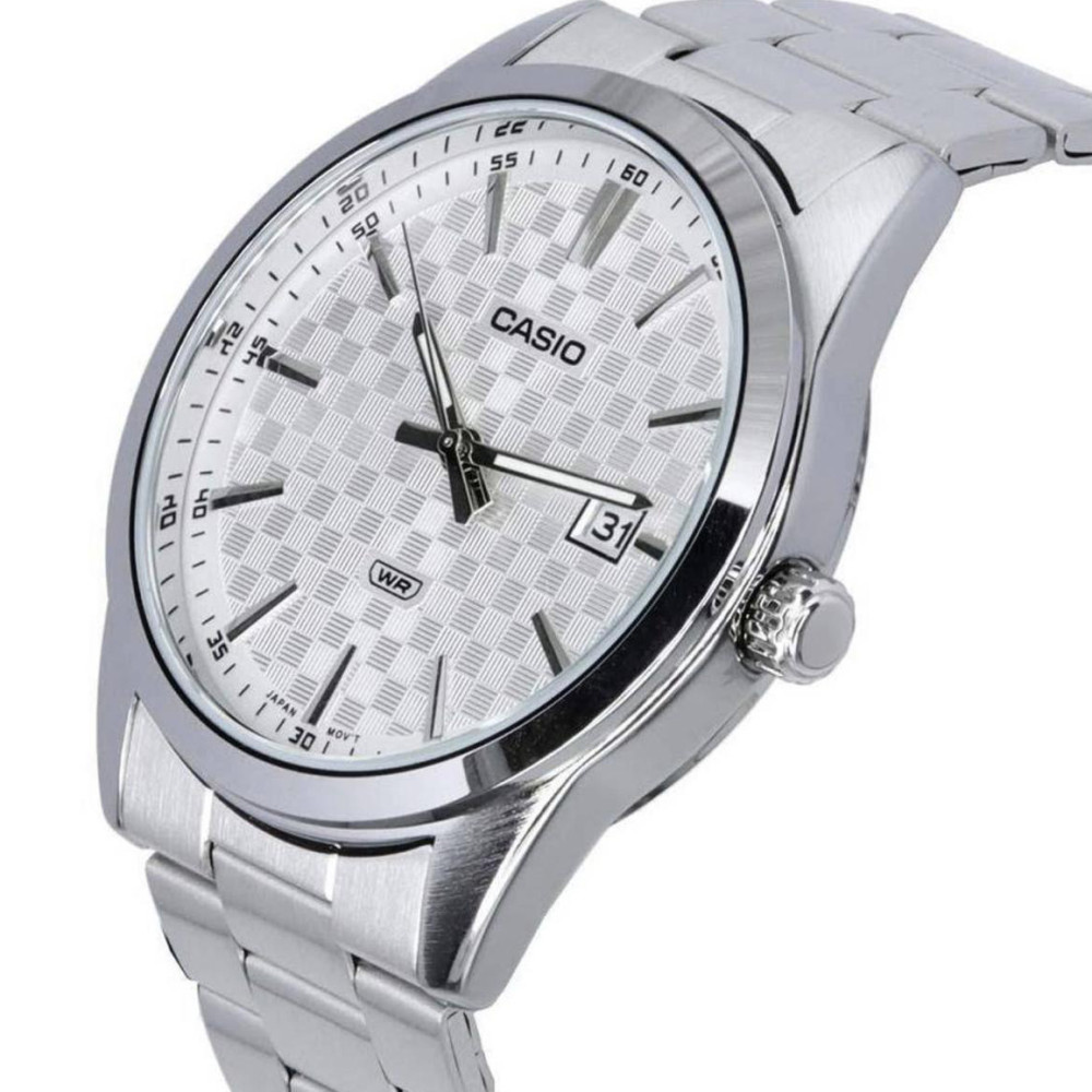Casio MTP-VD03D-7A вирізняється поєднанням світлого циферблату з металевим корпусом і браслетом. Такий дизайн забезпечує чітке зчитування часу й універсальність образу без надмірних деталей. Металевий браслет надійно фіксує годинник на зап’ясті й забезпечує комфорт упродовж дня. Модель органічно поєднується і з повсякденним, і з діловим одягом.