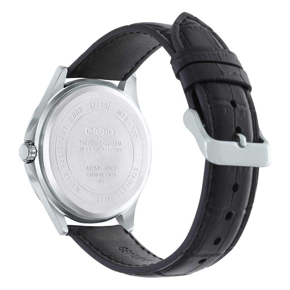 Casio MTS-100L-1A оснащений надійним кварцовим механізмом, який забезпечує стабільну точність ходу. Однією з ключових переваг моделі є сапфірове скло, стійке до подряпин і зберігає бездоганний вигляд навіть при активному щоденному використанні. Чорний циферблат із чіткими індексами та стрілками гарантує зручне зчитування часу, а віконце дати додає практичності. Корпус виготовлений із нержавіючої сталі, що забезпечує міцність і довговічність конструкції, а класичний шкіряний ремінець дарує комфорт протягом усього дня.
