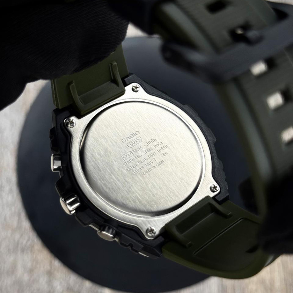 Дизайн Casio MWA-300H-3A побудований на поєднанні темного циферблату та міцного полімерного ремінця в зеленому тоні, що створює спортивний і збалансований вигляд. Такий контраст дозволяє годиннику залишатися виразним, але не надто помітним, що робить його універсальним аксесуаром для різних ситуацій — від прогулянок на природі до буденних справ у місті. Темний циферблат із контрастними мітками забезпечує чітке та швидке зчитування часу при будь-якому освітленні. Полімерний ремінець легко адаптується до зап’ястя, фіксує годинник надійно, але не створює відчуття дискомфорту навіть при тривалому носінні. У сукупності ці елементи роблять модель не лише стильним, але й практичним аксесуаром на кожен день.