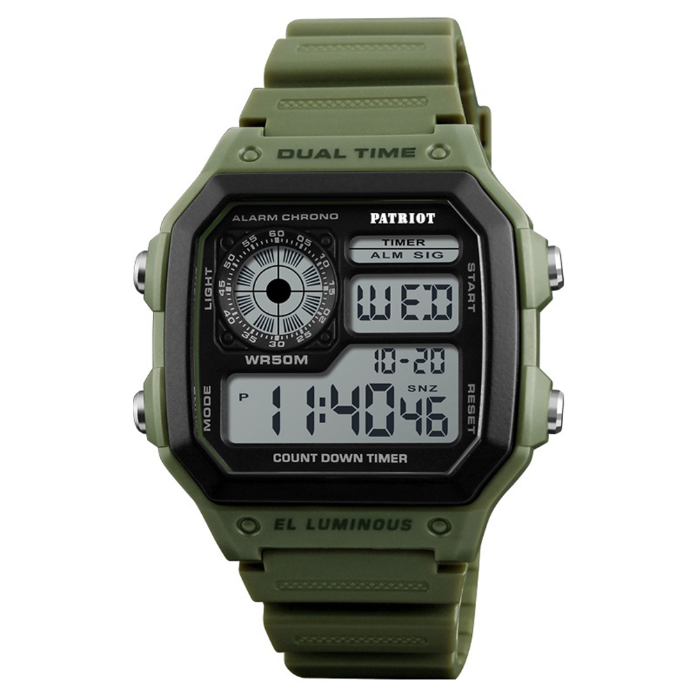 Материалы: Корпус изготовлен из полимера, что обеспечивает легкость и прочность. Ремешок из каучука гарантирует удобную посадку на запястье и выносливость в любых условиях. Цвет ремешка — болотный — создает стильный контраст с черным корпусом.
