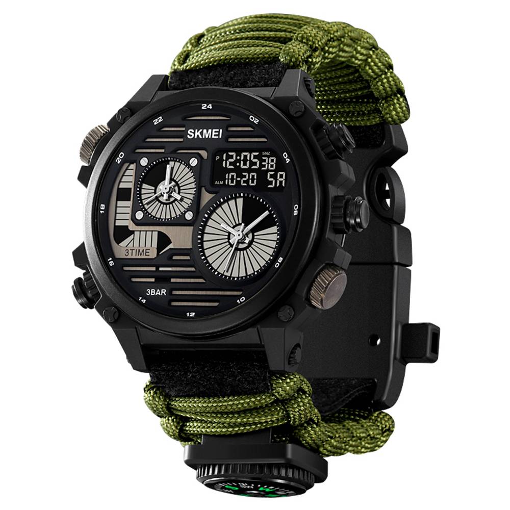 Часы Skmei 2202NAG Army Green – надежный спутник для активного образа жизни. Водонепроницаемость до 50 метров обеспечивает защиту на водных занятиях, а кварцевый механизм обеспечивает точность. Корпус из полиуретана и ремешок из паракорда гарантируют выносливость в условиях эксплуатации. Спортивный и армейский стиль сочетаются в дизайне, включающем электролюминесцентную подсветку. Функции будильника, календаря, второго часового пояса и секундомера производят его практическим помощником. Часы имеют круглую форму и содержат стрелочно-электронный циферблат с индексами и арабскими цифрами. Длина ремешка составляет 27 см, а вес часов – 80 грамм. Бренд Skmei предоставляет 12-месячную гарантию на этот модный аксессуар.