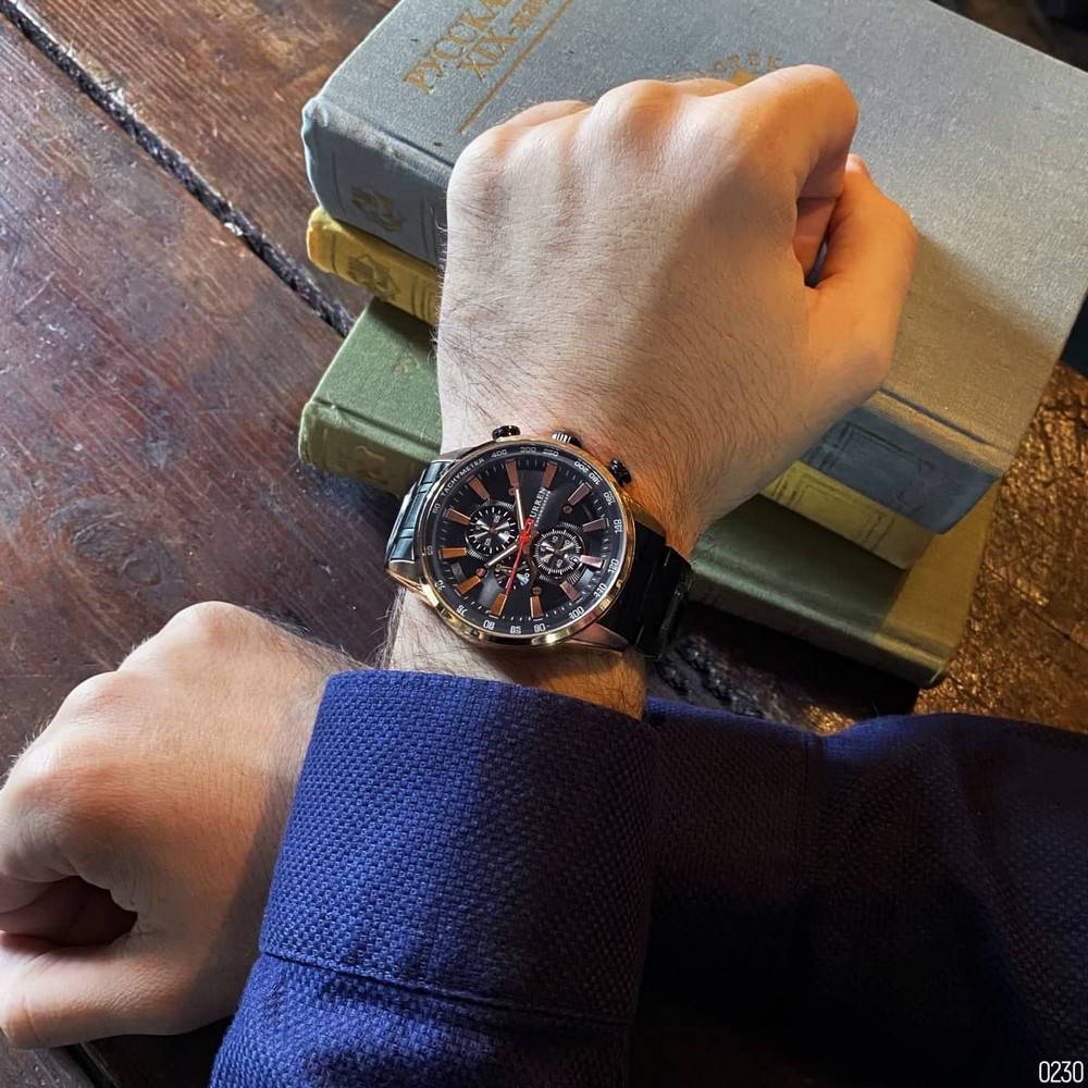Корпус часов изготовлен из высококачественной часовой стали бронзового цвета, что придаёт ему роскошный вид. Диаметр корпуса составляет 47 мм, а толщина - 14 мм. Благодаря этим параметрам он прекрасно сидит на запястье и подходит для любого мужчины. Металлический чёрный ремешок длиной 23 см обеспечивает комфорт и надёжность при ношении. Раскладная застёжка позволяет легко регулировать его по мере необходимости.