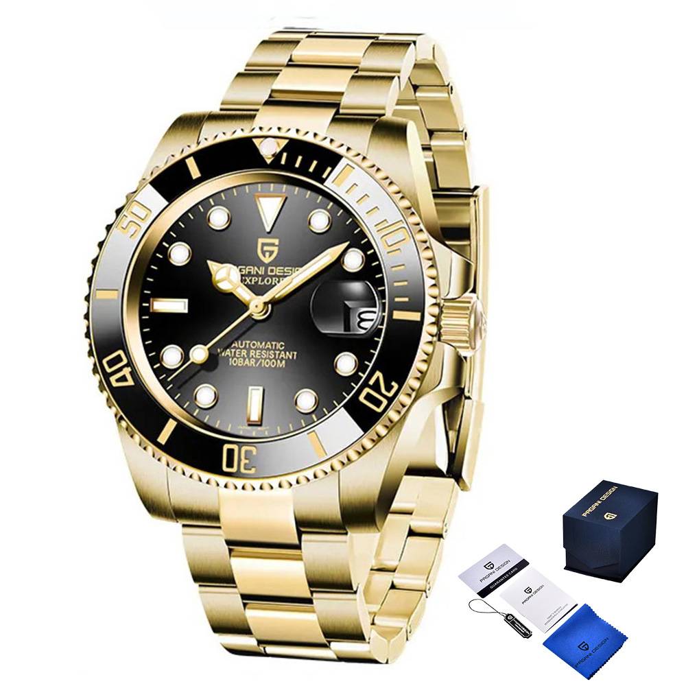 Часы Pagani Design PD-1661 Gold-Black сочетает элегантный стиль и надежность. Изготовлен из нержавеющей стали, он имеет золотистый корпус и браслет, что придает ему роскошный вид. Оснащенные механическим автоматическим механизмом, часы также имеют сапфировое стекло, которое обеспечивает высокую стойкость к царапинам. Водонепроницаемость до 100 м делает его безупречным для активного использования. Цифровой циферблат в стиле casual с люминесцентной подсветкой и функцией календаря делает его практичным в повседневной жизни. Гарантия на эти часы составляет 12 месяцев. Размеры корпуса – 40 х 40 мм, вес – 152 г.