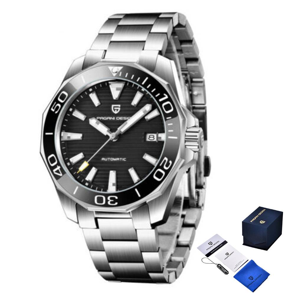 Часы Pagani Design PD-1668 в серебристом и черном цветах сочетает в себе элегантный классический стиль и функциональность. механическим с автоподзаводом, часы демонстрируют точность благодаря стрелочному циферблату с люминесцентной подсветкой. Размеры 43 х 43 мм и 24 см длины ремешка обеспечивают комфорт и стиль. составляет 12 месяцев.