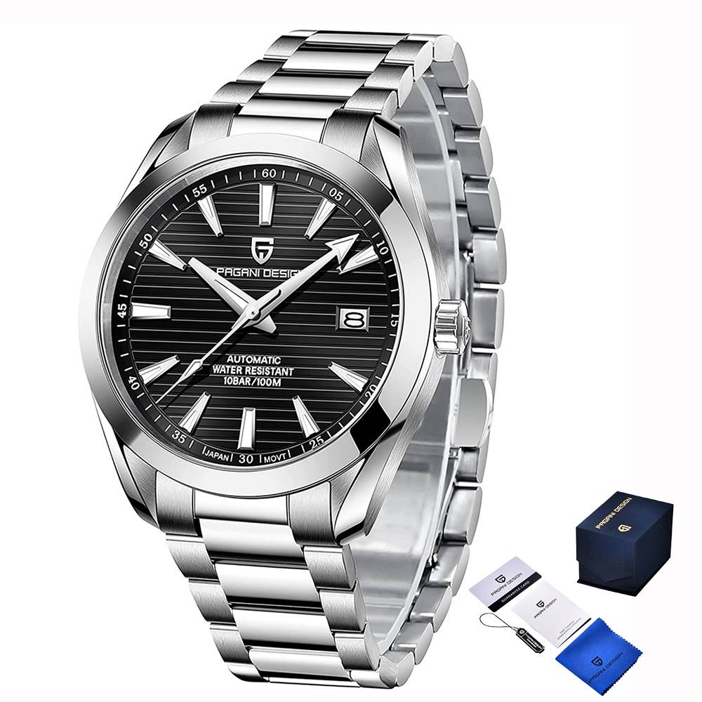 Pagani Design PD-1688 – современные мужские часы классического стиля, сочетающие элегантность и функциональность. Корпус и ремешок изготовлены из нержавеющей стали серебристого цвета, обеспечивая высокую прочность и долговечность. Механический механизм с автоподзаводом гарантирует точность и надежность.