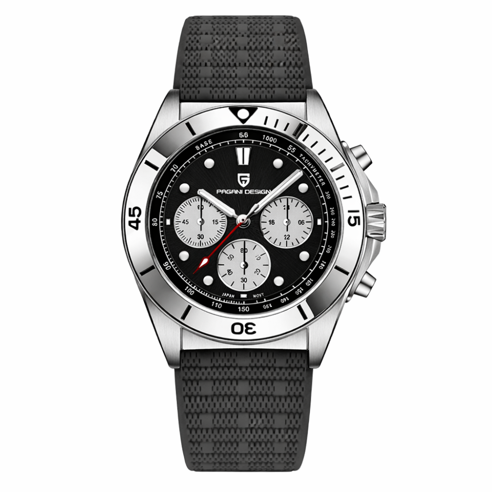 Часы Pagani Design PD-1705-1 Silver-Black сочетает стиль и функциональность. Он имеет круглый корпус из нержавеющей стали серебристого цвета, а черный резиновый ремешок обеспечивает комфорт и надежность. Привлекательный циферблат с арабскими цифрами и точками дополнен хронографом и люминесцентной подсветкой для удобства использования в любое время. Благодаря водонепроницаемости до 100 м, часы идеально подходят для активных мужчин. Сапфировое стекло обеспечивает высокую стойкость к царапинам, а кварцевый механизм гарантирует точность времени. Гарантия на изделие составляет 12 месяцев. Размеры часов составляют 42 х 42 мм, а вес – 104 г.