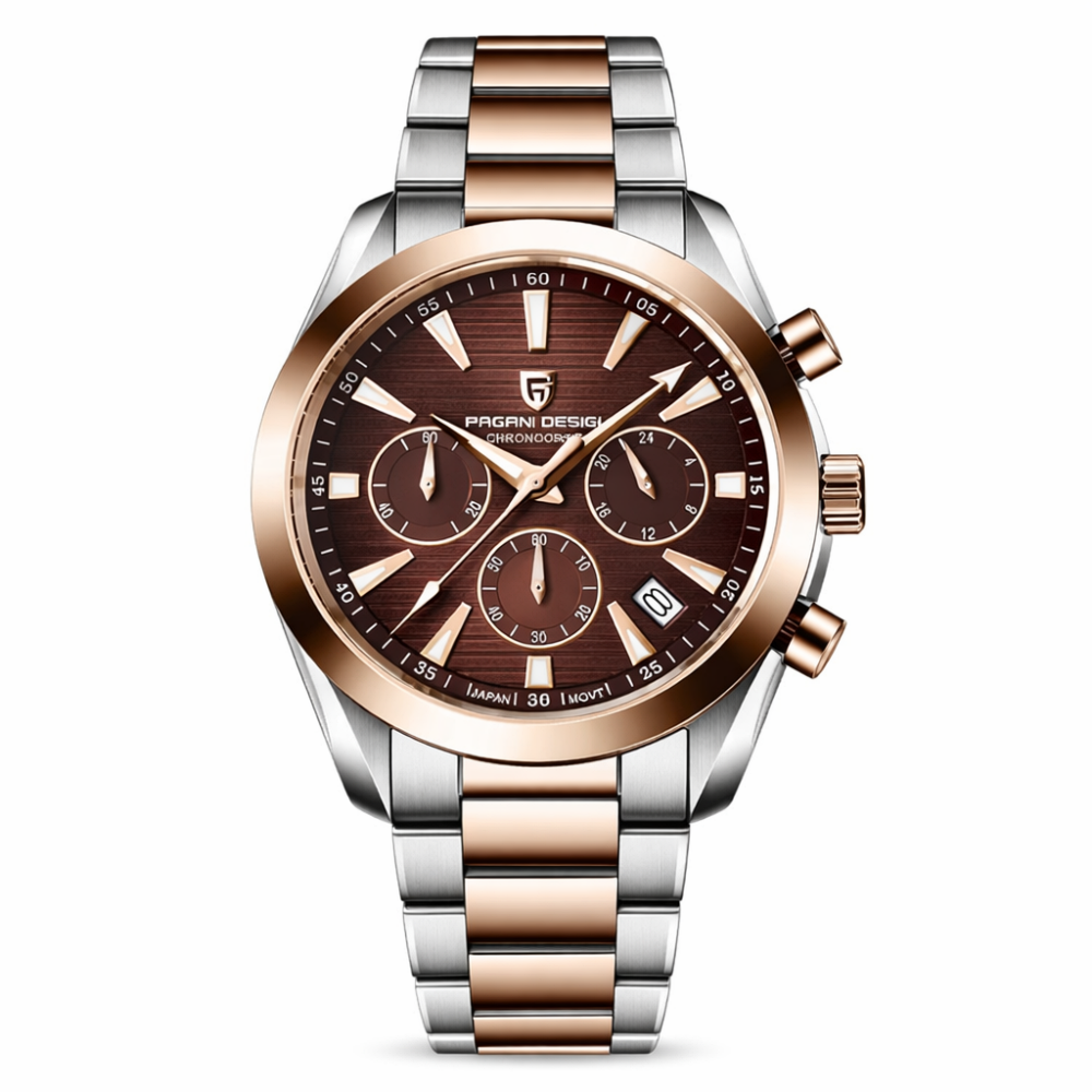 Часы Pagani Design PD-1712 Silver-Rose Gold-Brown сочетают элегантный дизайн и практичность. Изготовленные из нержавеющей стали, они обладают круглой формой корпуса и водонепроницаемостью до 100 м, что делает их идеальными для активного образа жизни. Сапфировое стекло обеспечивает высокую прочность и стойкость к царапинам. Механизм кварцевый и стрелочный циферблат дополнен индикацией часов, минут и секунд, а также функциями календаря и хронографа.