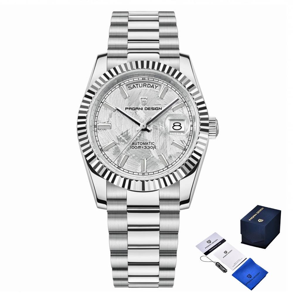 Часы Pagani Design PD-1752 Silver-Silver – это стильный мужской аксессуар, изготовленный из нержавеющей стали, отличающийся своей элегантностью и классическим дизайном. Механическое устройство с автоподзаводом обеспечивает точность в измерении времени. Водонепроницаемость до 100 метров делает его безупречным для активного использования. Циферблат с сапфировым стеклом имеет индикацию часов, минут и секунд, а также календарь. Диаметр корпуса составляет 36 мм, что придает часам изысканный вид. Серебристый цвет корпуса и ремешка придает ему современный шарм. Гарантия на часы – 12 месяцев.