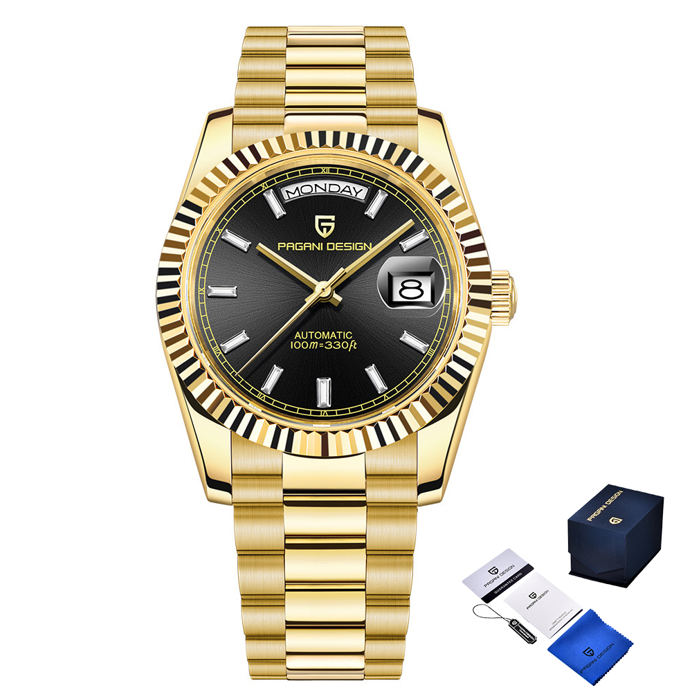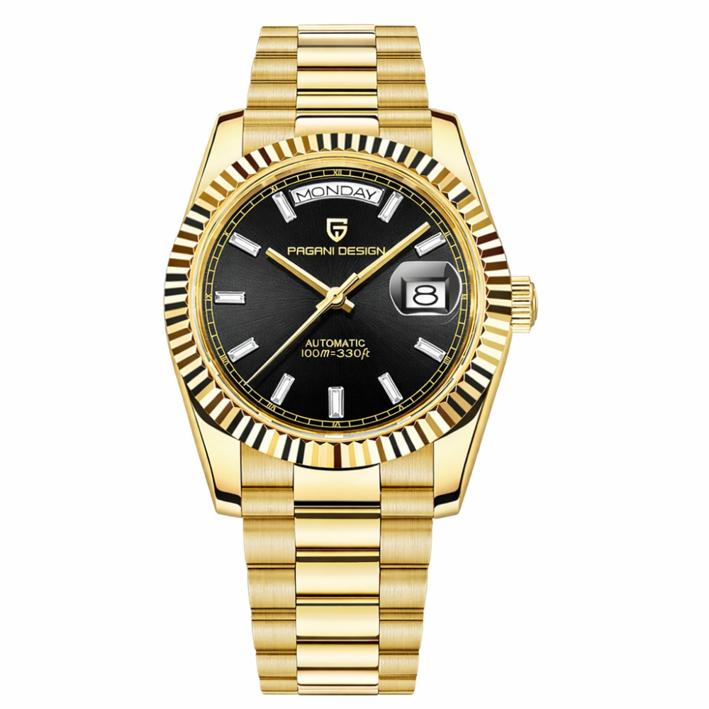 Мужские часы Pagani Design PD-1783 сочетают элегантный дизайн с практичными функциями. Изготовленные из нержавеющей стали, они обладают водонепроницаемостью до 100 метров, что делает их идеальными для активного образа жизни. Сапфировое стекло обеспечивает высокую износостойкость, а механический механизм с автоподзаводом гарантирует точность времени. Циферблат выполнен в классическом стиле, с арабскими цифрами и индексами, что создает изысканный вид. Часы имеют золотистый корпус и ремешок, его размеры составляют 40 х 40 мм. Pagani Design PD-1783 – это стильный аксессуар для современного мужчины, ценящий качество и дизайн. Гарантия на изделие составляет 12 месяцев.