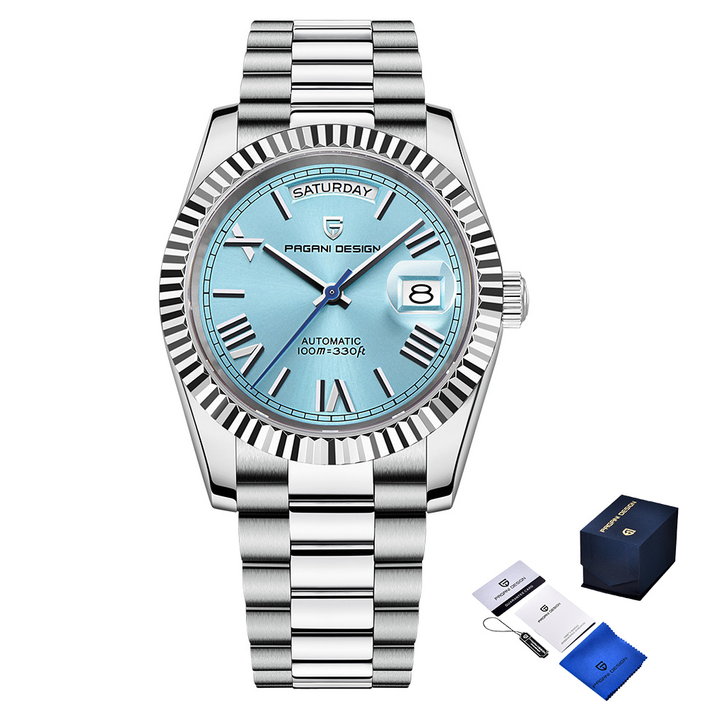 Часы Pagani Design PD-1783 Silver-Tiffany – стильный аксессуар для современного мужчины. Он совмещает изысканный дизайн и функциональность. Корпус и ремешок изготовлены из нержавеющей стали серебристого цвета, что придает элегантности. Часы имеют механический механизм с автоподзаводом и сапфировое стекло, что обеспечивает высокую износостойкость. Водонепроницаемость до 100 метров позволяет использовать его во время активного отдыха. Циферблат имеет стрелочную индикацию с арабскими цифрами и точками, а также функцию календаря. Стиль часов универсален – он подходит как для классического, так и для повседневного (casual) образа. Гарантия на изделие – 12 месяцев.