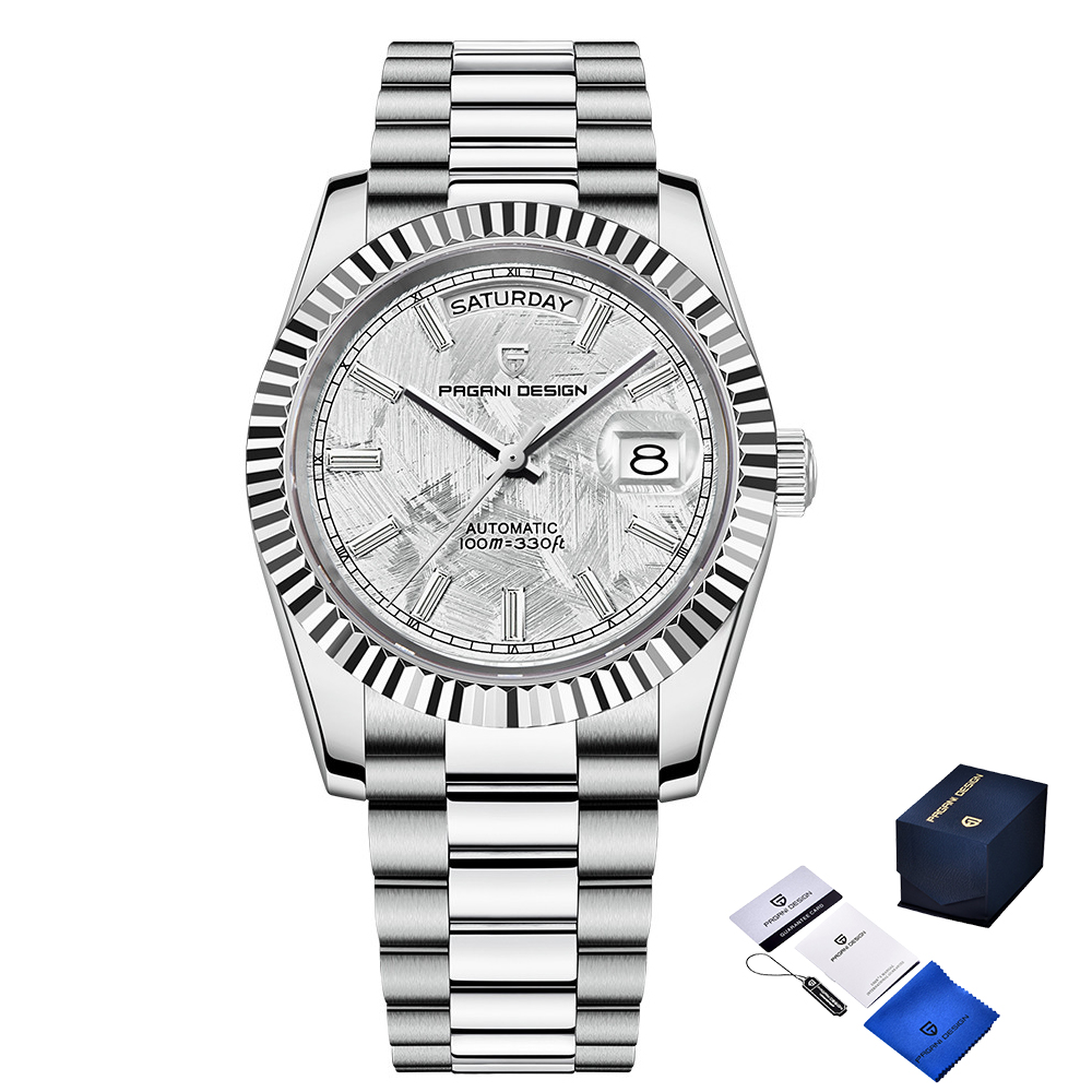 Часы Pagani Design PD-1783 Silver-White – это стильные механические часы с автоподзаводом, которые сочетают в себе элегантный дизайн и функциональность. Он имеет круглую форму корпуса из нержавеющей стали и серебристый цвет, что придает ему современный вид. Эти мужские часы оснащены сапфировым стеклом и водонепроницаемы на глубину до 100 метров, что делает его идеальным для активного образа жизни. Циферблат с индикацией часов, минут, секунд и календарем поражает четкостью, а также содержит арабские цифры и точки для удобства чтения времени. Часы комплектуются браслетом из нержавеющей стали с длиной 20 см и имеют общий вес 149 г. Производится в Китае и снабжается гарантией на 12 месяцев. Его стиль подходит для casual и классических образов.