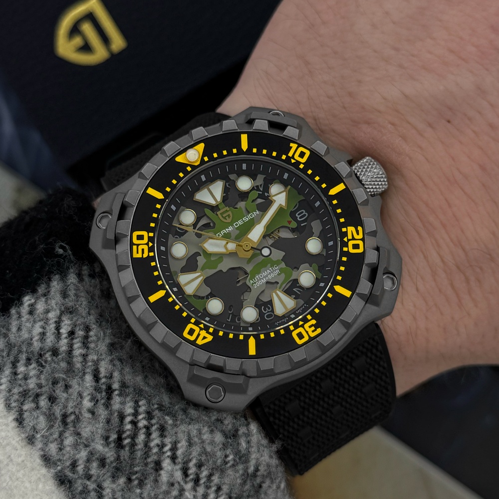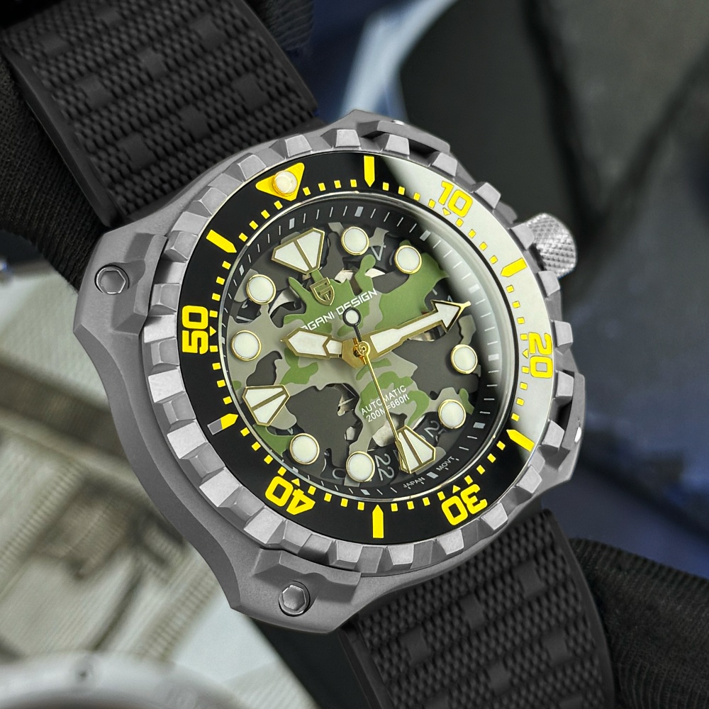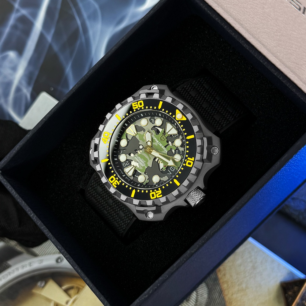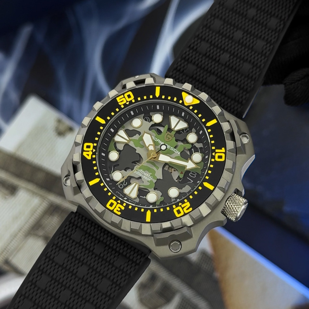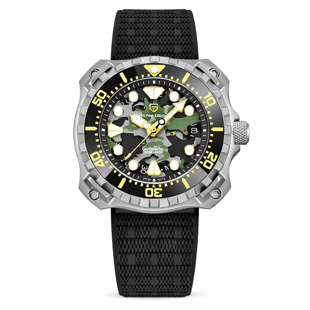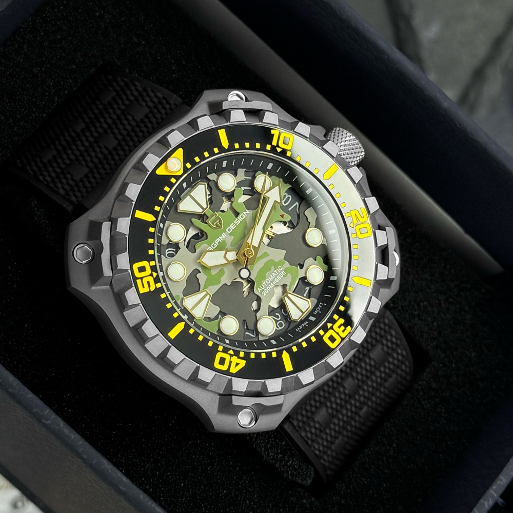 Часы Pagani Design YN009 Silver-Camo – это стильный выбор для мужчин, которые ценят функциональность и современный дизайн. Изготовленные из нержавеющей стали, эти часы обладают высоким уровнем водонепроницаемости до 100 метров, что делает их идеальными для активного образа жизни. Квадратный корпус серебристого цвета в сочетании с черным резиновым ремешком придает часам армейский стиль. Сапфировое стекло обеспечивает высокий уровень защиты, а люминесцентная подсветка позволяет считывать время в темноте. Часы оборудованы механическим механизмом с автоподзаводом, имеют функцию календаря и индикацию часов, минут, секунд и даты. Размеры часов составляют 43,3 х 40,7 мм, вес – 116 г, а длина и ширина ремешка составляют 24 и 22 мм соответственно. Гарантия на изделие – 12 месяцев.