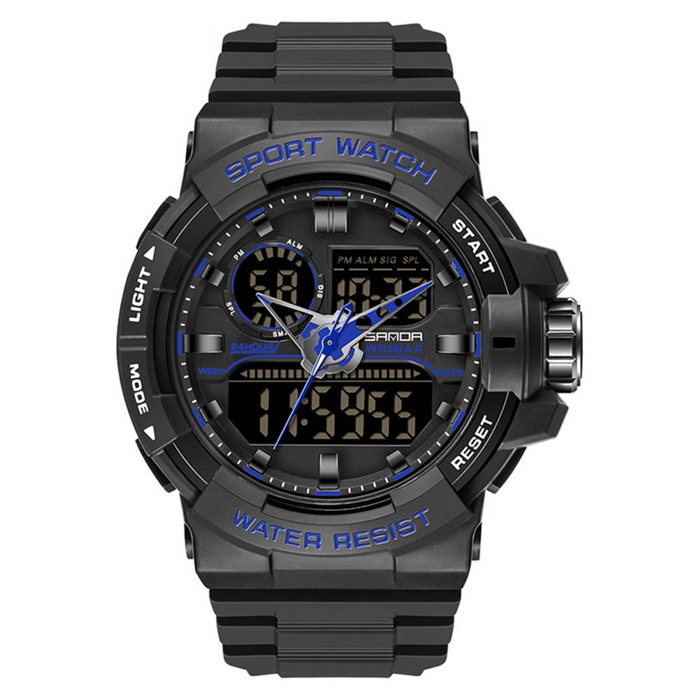 Часы оснащены электронным механизмом и стрелочно-электронным циферблатом с индикацией часов, минут и секунд. Вы сможете легко читать время благодаря четким арабским цифрам и индексам. Особенностью Sanda 6025 Black-Blue является электролюминесцентная подсветка, которая позволяет удобно использовать часы даже в темноте.