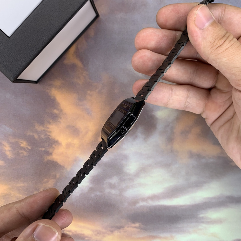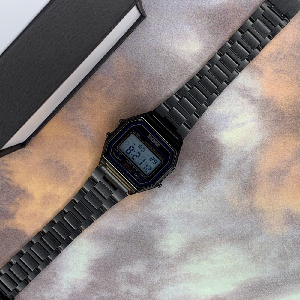 Электронный циферблат с арабскими цифрами, подсветкой и индикацией времени, даты и дня недели делает их удобными для ежедневного использования. Часы оборудованы функциями будильника, секундомера и второго часового пояса, что придает им функциональность. Прямоугольная форма и черный цвет корпуса и ремешка придают им современный вид. Дополнительное преимущество – компактные размеры (36 х 33 мм) и легкий вес (56 г), обеспечивающие комфорт при ношении. Гарантия на часы составляет 12 месяцев.