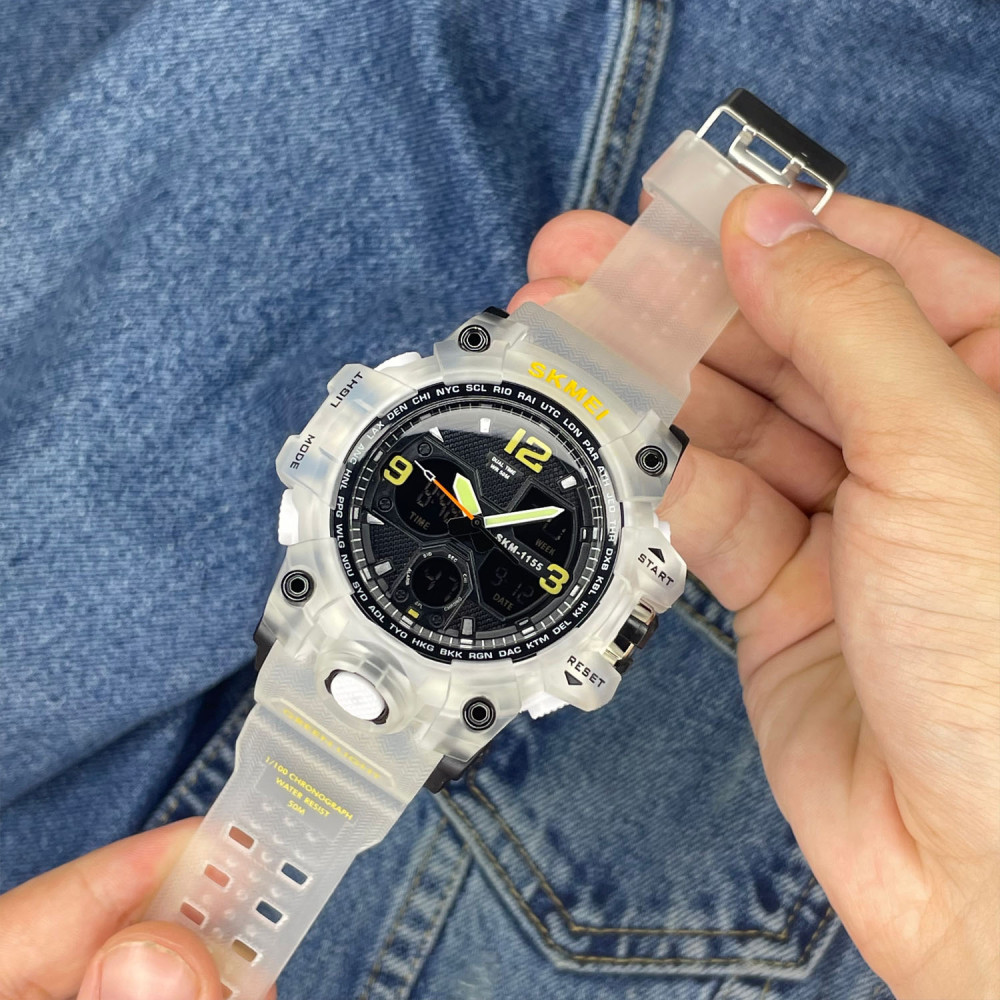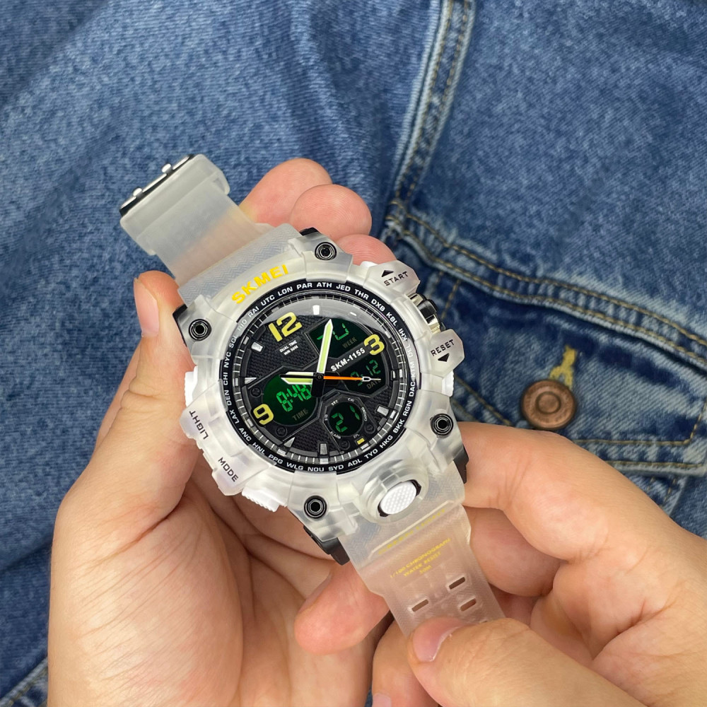 Механизм часов кварцевый с комбинированным циферблатом (стрелочно-электронный), показывающий часы, секунды, день недели, месяц и число. Дополнительные функции включают будильник, секундомер и второй часовой пояс. Часы завершают классическая застежка, обеспечивающая надежную фиксацию на запястье. Гарантия на часы составляет 12 месяцев, что подтверждает его качество. Skmei 1155BWT – идеальный выбор для активных мужчин, ценящих стиль и функциональность.