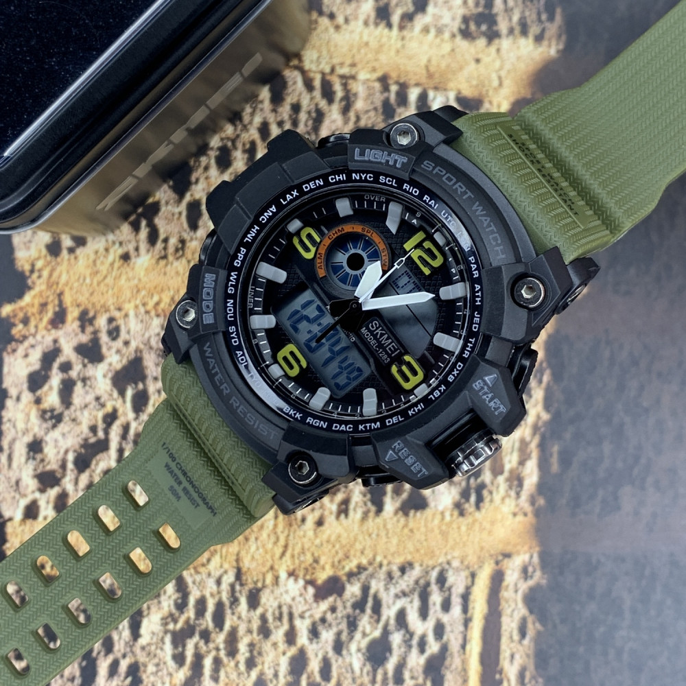 Высококачественное поликарбонатное стекло защищает его от царапин, а стильный черный корпус в сочетании с зеленым ремешком придает ему армейский вид. Часы имеют компактные размеры (55 х 54 мм) и толщину 17 мм, что делает его идеальным выбором для активного образа жизни.