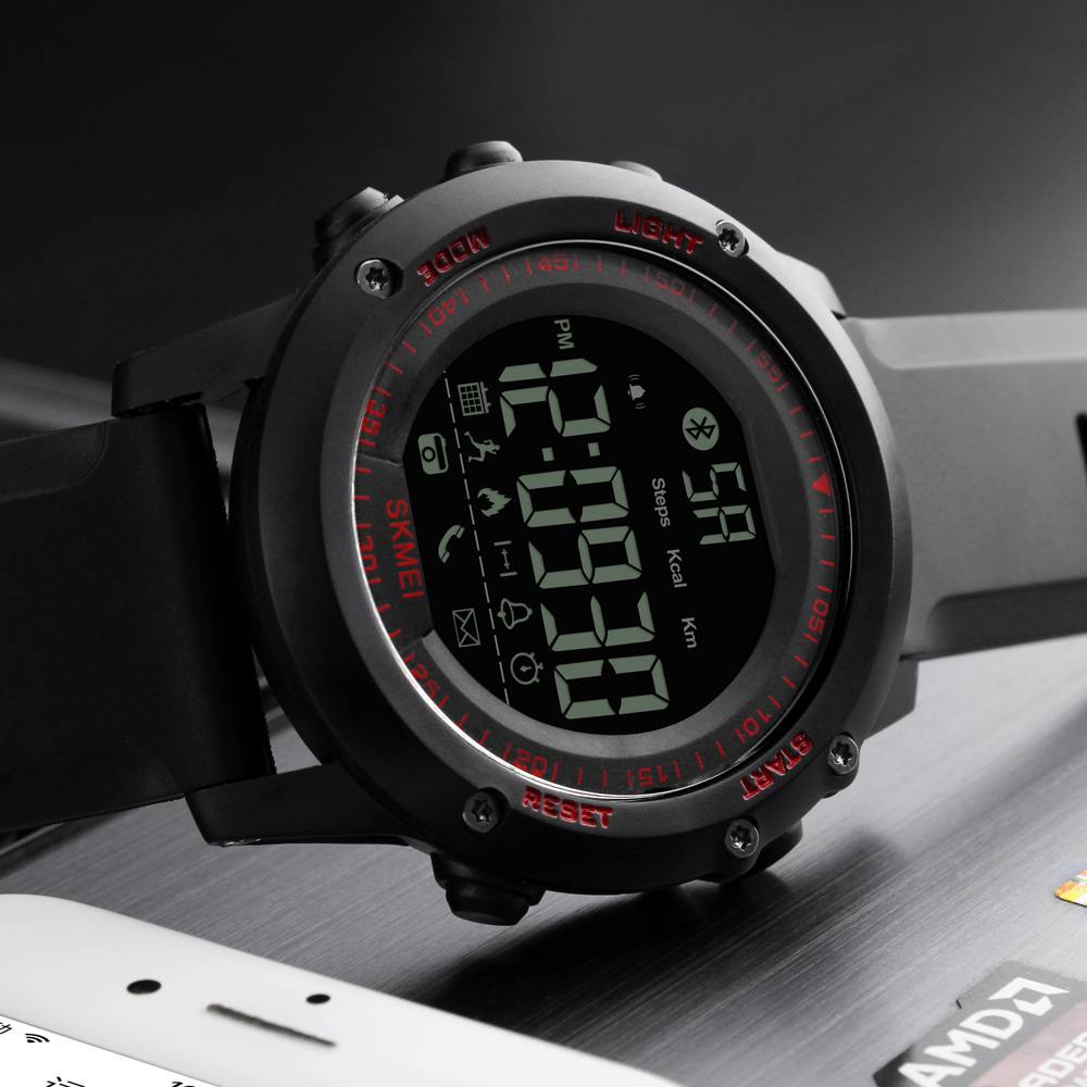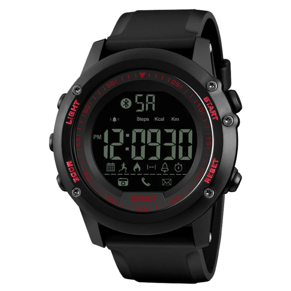 Эти спортивные электронные часы изготовлены из полимерного корпуса красного цвета и имеют полиуретановый ремешок черного оттенка. Водонепроницаемость до 50 м делает его идеальным выбором для активных людей. Часы оборудованы различными функциями, такими как будильник, поддержка Bluetooth, таймер, второй часовой пояс, счетчик калорий и секундомер.