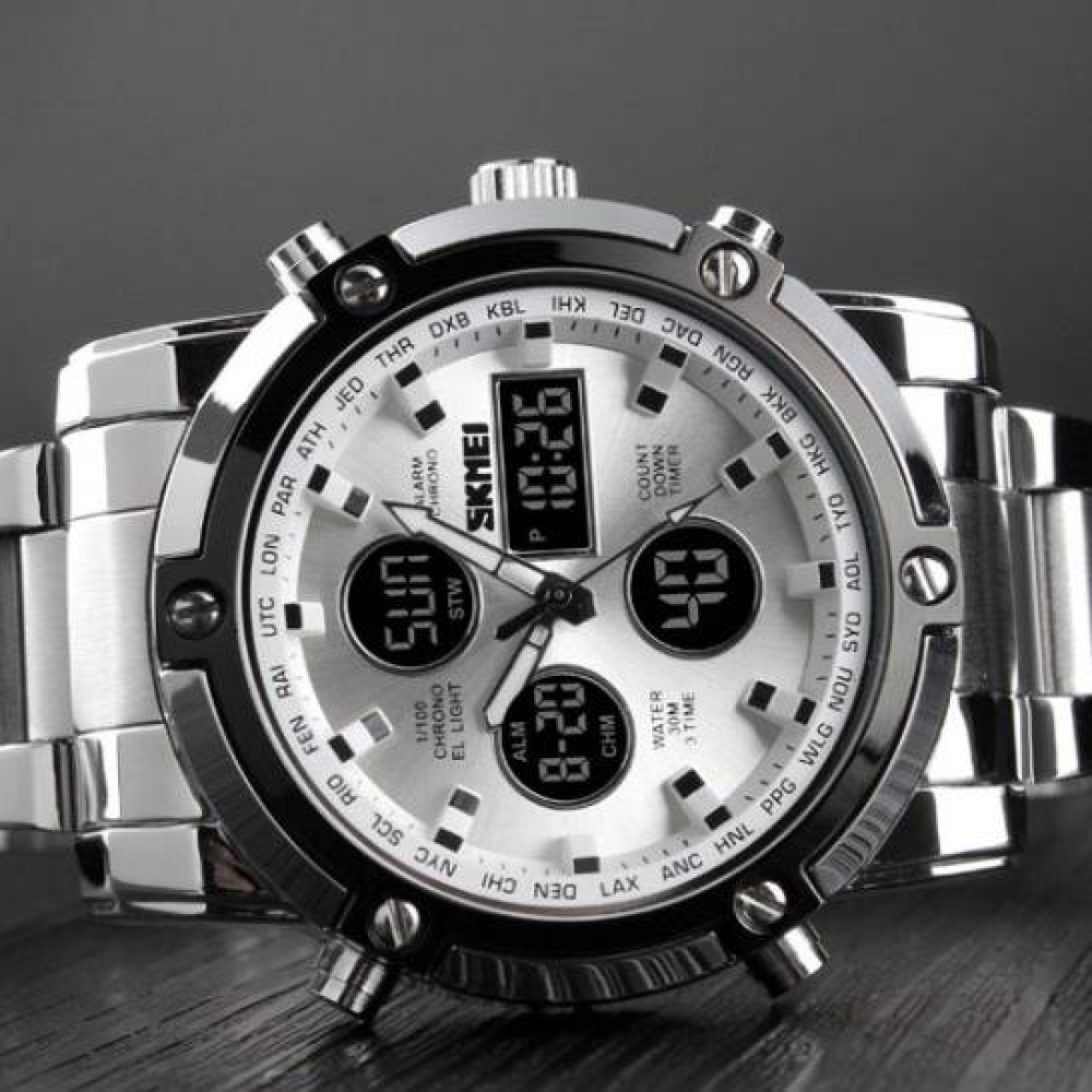 Часы Skmei 1389SI Silver-Black-Silver – это стильный и функциональный аксессуар для современного мужчины. Он имеет круглую форму корпуса с металлическим материалом и водонепроницаемостью до 30 метров. Часы оснащены кварцевым механизмом и комбинированным стрелочно-электронным циферблатом, легко читаемым благодаря арабским цифрам.