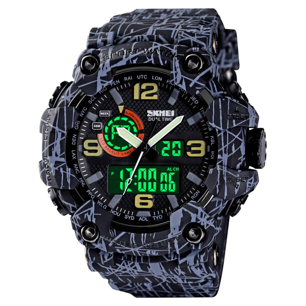 Часы Skmei 1520GYBK — стильный спортивный аксессуар для мужчин, сочетающий в себе функциональность и современный дизайн. Корпус часов изготовлен из полимера в камуфляжном цвете, что придает ему армейский вид, а каучуковый ремешок обеспечивает комфорт при ношении. С водонепроницаемостью до 50 метров он идеально подходит для активного образа жизни. Часы оборудованы кварцевым механизмом, стрелочно-электронным циферблатом и электролюминесцентной подсветкой, что обеспечивает хорошую видимость в темноте. Среди функций будильник, секундомер и второй часовой пояс. Гарантия на часы составляет 12 месяцев. Диаметр корпуса – 56 мм, толщина – 20 мм, вес – 81 г.