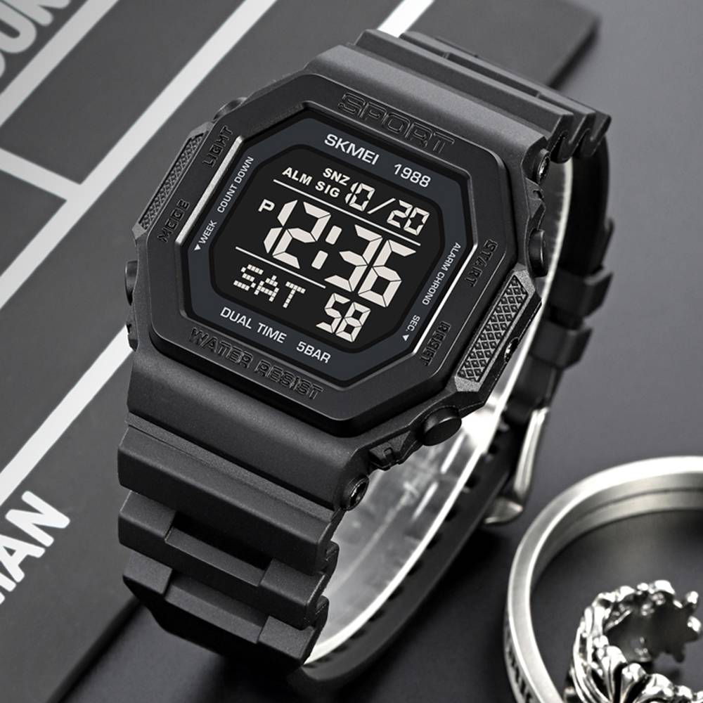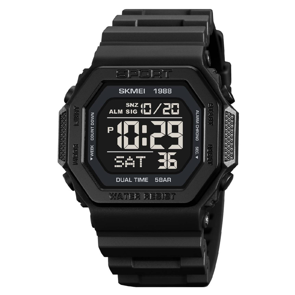 Часы Skmei 1988BK Black — это стильный спортивный аксессуар, сочетающий в себе функциональность и современный дизайн. Он оснащен электронным механизмом и имеет квадратную форму корпуса, выполненного из полимера в черном цвете. Ремешок из каучука обеспечивает комфортное ношение. Часы водонепроницаемые до 50 метров, что делает его идеальным для активного образа жизни. Основные функции включают будильник, календарь, второй часовой пояс и секундомер. Индикация времени и даты представлена арабскими цифрами, а электролюминесцентная подсветка позволяет читать информацию в темноте. Вес часов составляет 48 граммов, а длина ремешка – 27 см. Подходит для мужчин, оснащен 12-месячной гарантией, изготовлен в Китае.
