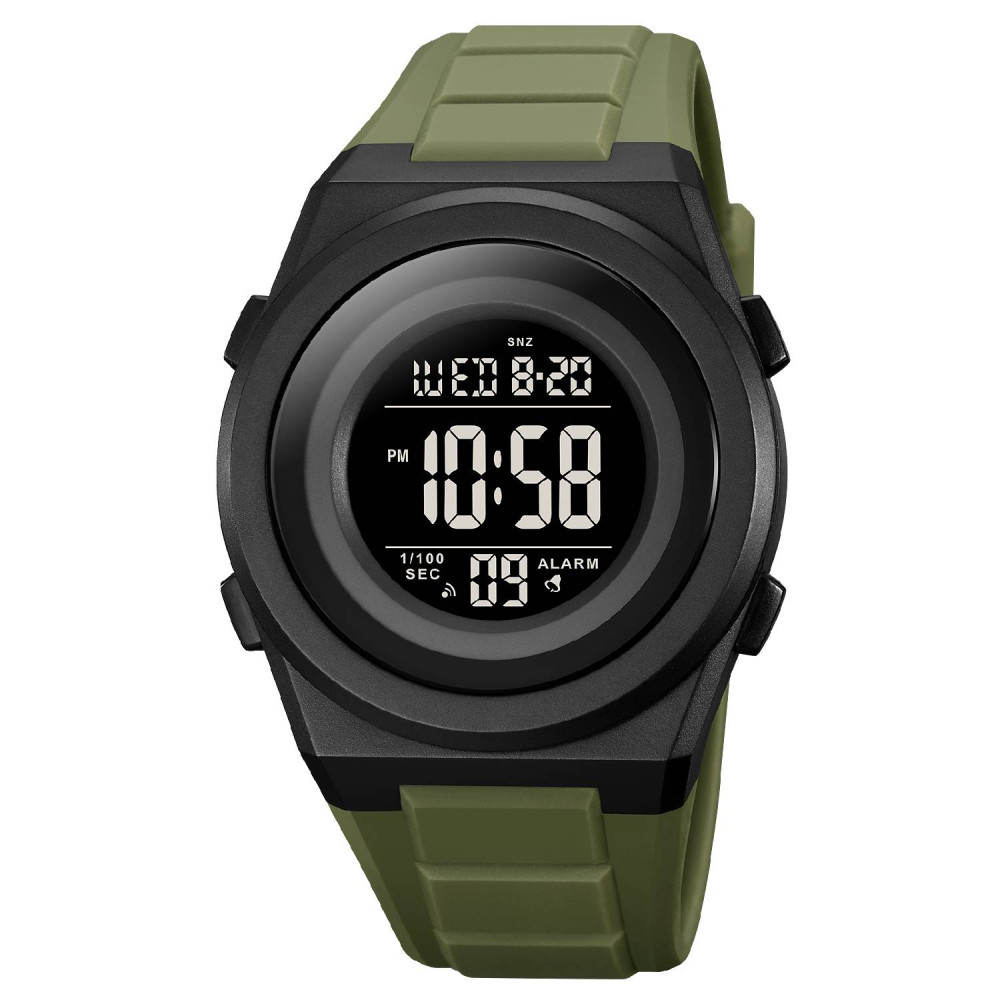 Стильные спортивные часы Skmei 2080AG в армейском зеленом цвете – идеальный выбор для активных мужчин. Водонепроницаемость до 50 метров, что позволяет использовать его во время водных видов спорта. Корпус выполнен из прочного полимера, а ремешок из каучука обеспечивает комфорт во время ношения. Часы имеют электронный циферблат с арабскими цифрами и электролюминесцентной подсветкой, что гарантирует удобство в темноте.