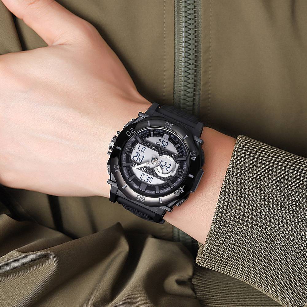Часы оснащены электронным механизмом, стрелочно-электронным циферблатом с арабскими цифрами и электролюминесцентной подсветкой.