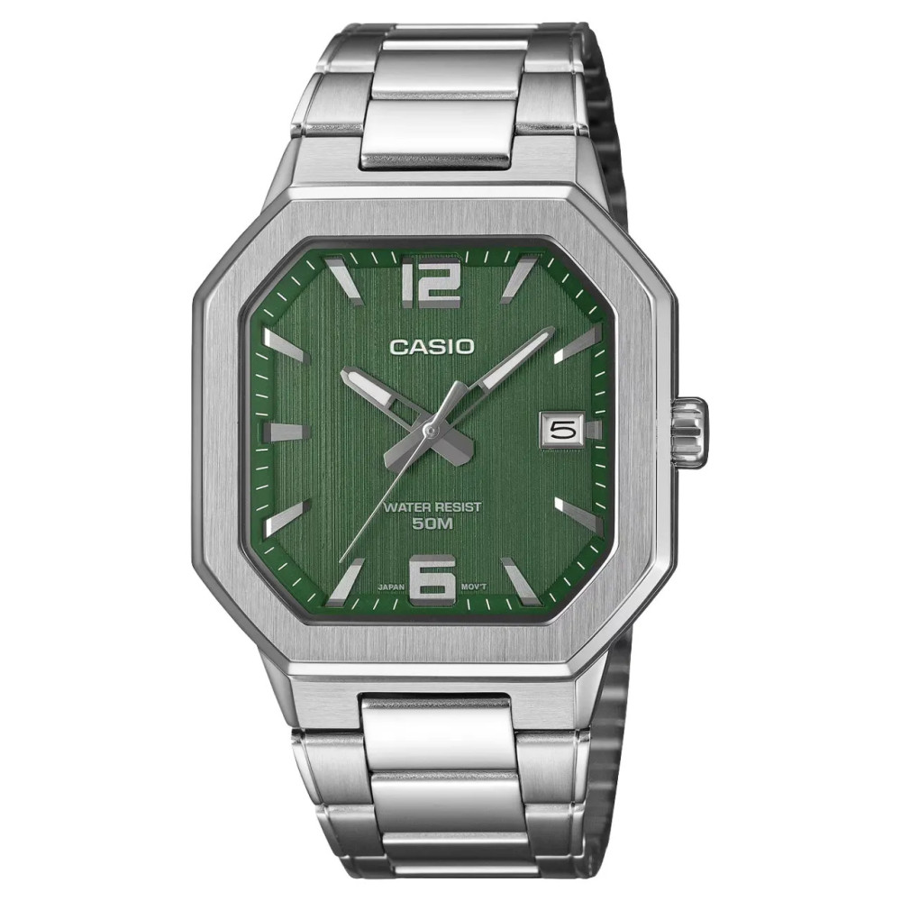 Зелёный циферблат с чёткой разметкой и индексами создаёт выразительный визуальный акцент и хорошо читается при разном освещении. Объёмный стальной безель придаёт модели спортивно-геометричный характер, усиливая её современный стиль. Классические стрелки гармонично сочетаются с минималистичным оформлением, сохраняя баланс между элегантностью и практичностью. Металлический браслет плавно интегрирован в корпус, обеспечивая комфортную посадку на запястье и целостность дизайна.