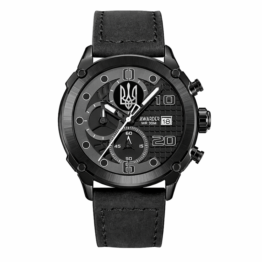 Головною перевагою Awarder 016 Тризуб срібло All Black є універсальність та міцність конструкції. Годинник виготовлений із високоякісних матеріалів: корпус виконаний із чорного металу, а ремінець — зі шкіри, що забезпечує комфорт під час носіння та довговічність виробу. Діаметр корпусу становить 46 мм, а вага — близько 65 г, тому годинник майже не відчувається на руці.