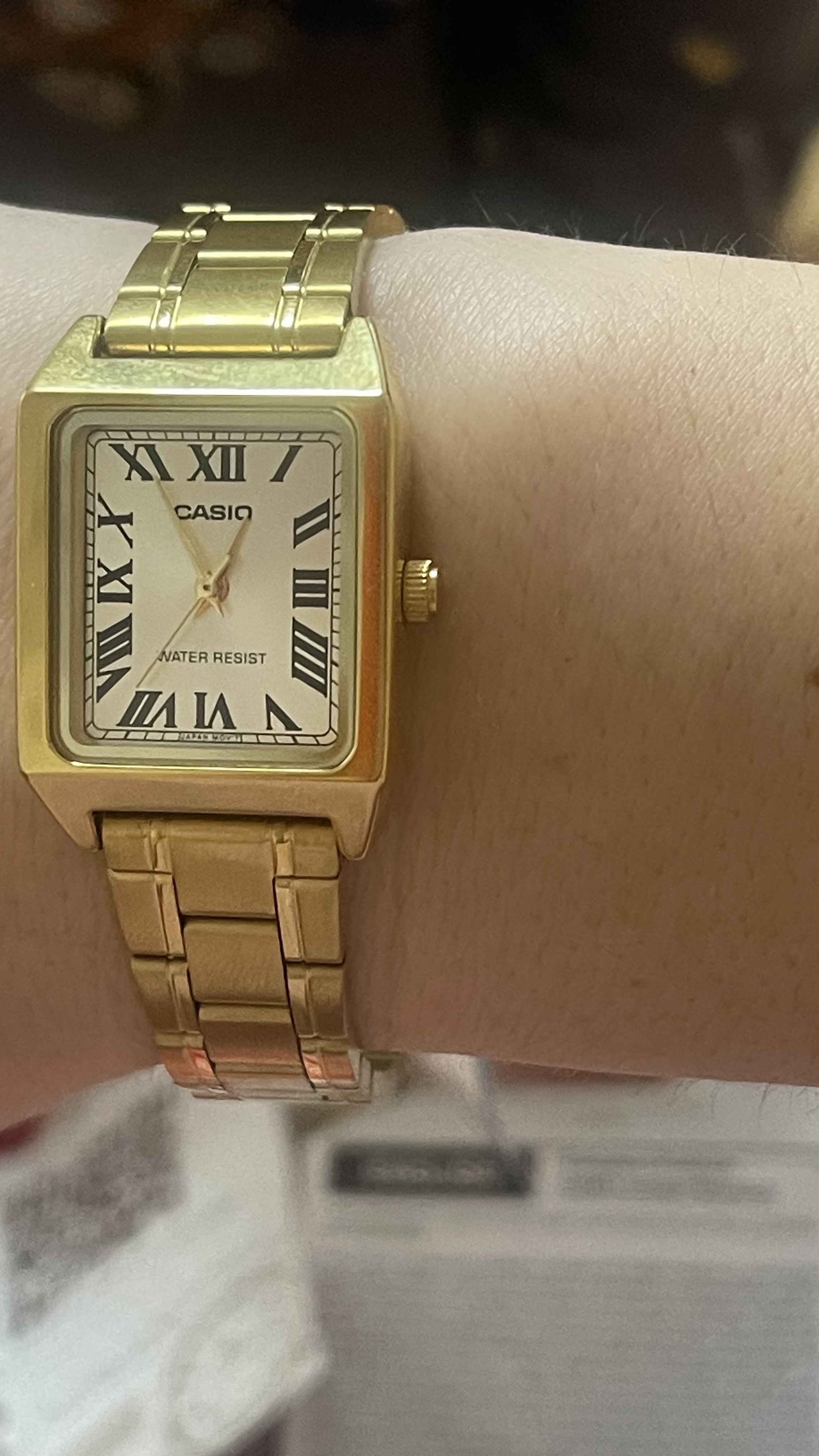 Металлический браслет золотистого цвета хорошо сидит на запястье и подходит для повседневной носки. Минеральное стекло защищает циферблат от царапин и помогает сохранять привлекательный вид часов в течение длительного времени. Базовый уровень водозащиты позволяет не снимать часы в обычных ситуациях.