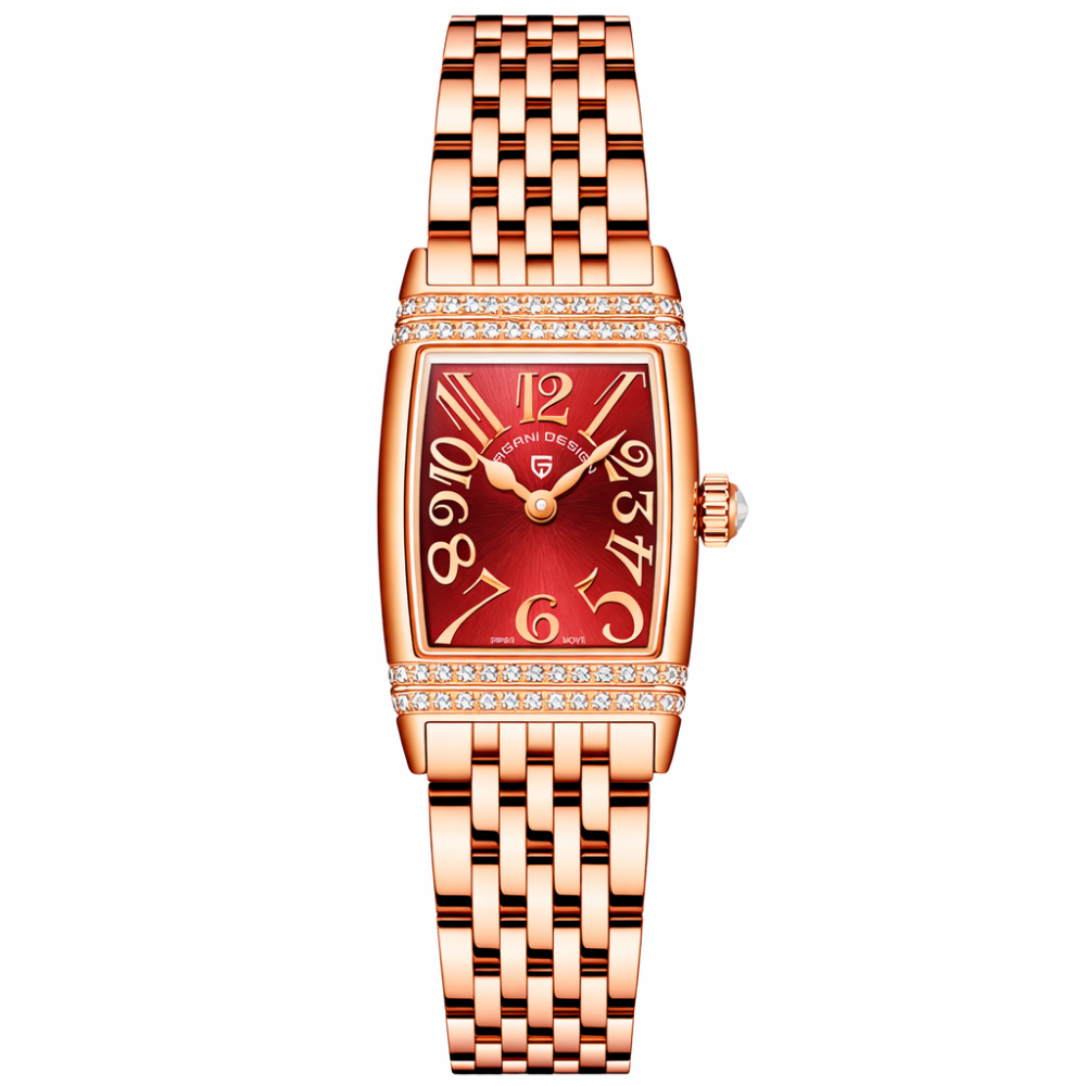 Часы Pagani Design PD-1737 в роскошном золотистом цвете с красными акцентами – это стильный аксессуар для женщин, сочетающий элегантность и функциональность. Его корпус и ремешок изготовлены из нержавеющей стали, что обеспечивает долговечность и комфорт при ношении. Сапфировое стекло защищает стрелочный циферблат с арабскими цифрами, что придает ему классический вид.