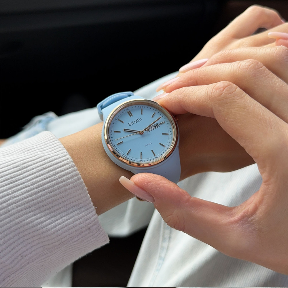 Часы Skmei 1747BU Blue – стильный женский аксессуар, сочетающий в себе элегантность и функциональность. Металлический корпус золотистого цвета с круглой формой имеет диаметр 42 мм и толщину 11 мм, что делает его удобным в носке. Силиконовый ремешок голубого цвета обеспечивает комфорт и надежность. Часы водонепроницаемые до 30 м, что позволяет использовать их в повседневной жизни без ограничений. Кварцевый механизм с минеральным стеклом надежно отображает время с индикацией часов, минут, секунд, дня недели и числа. Благодаря классическому дизайну, он подходит для разных стилей – от casual до классического. Гарантия на часы составляет 12 месяцев.
