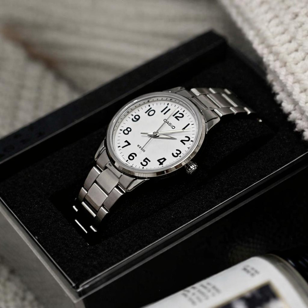Дизайн Casio LTP-1303D-7B побудований на поєднанні світлого металевого корпусу з браслетом та витонченого світлого циферблату з чіткими мітками. Таке рішення створює відчуття легкості й акуратності, роблячи годинник універсальним аксесуаром для різних стилів одягу. Світлий циферблат робить зчитування часу зручним та швидким, а металевий браслет надійно фіксує годинник на зап’ясті та забезпечує комфорт протягом усього дня. Модель виглядає елегантно, але при цьому не перевантажена декоративними елементами, що дозволяє годиннику органічно доповнювати образ без відволікання уваги.