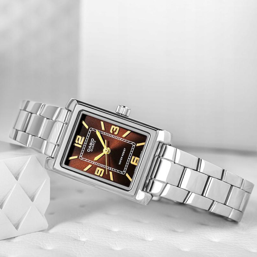Жіночий годинник Casio LTP-1234DD-5A поєднує витончену простоту та надійність. Його коричневий циферблат створює теплий і стильний образ, а сріблястий корпус з латуні і браслет із нержавіючої сталі додають відчуття розкоші. Прямокутна форма корпусу робить модель універсальною для повсякденного носіння та особливих подій.