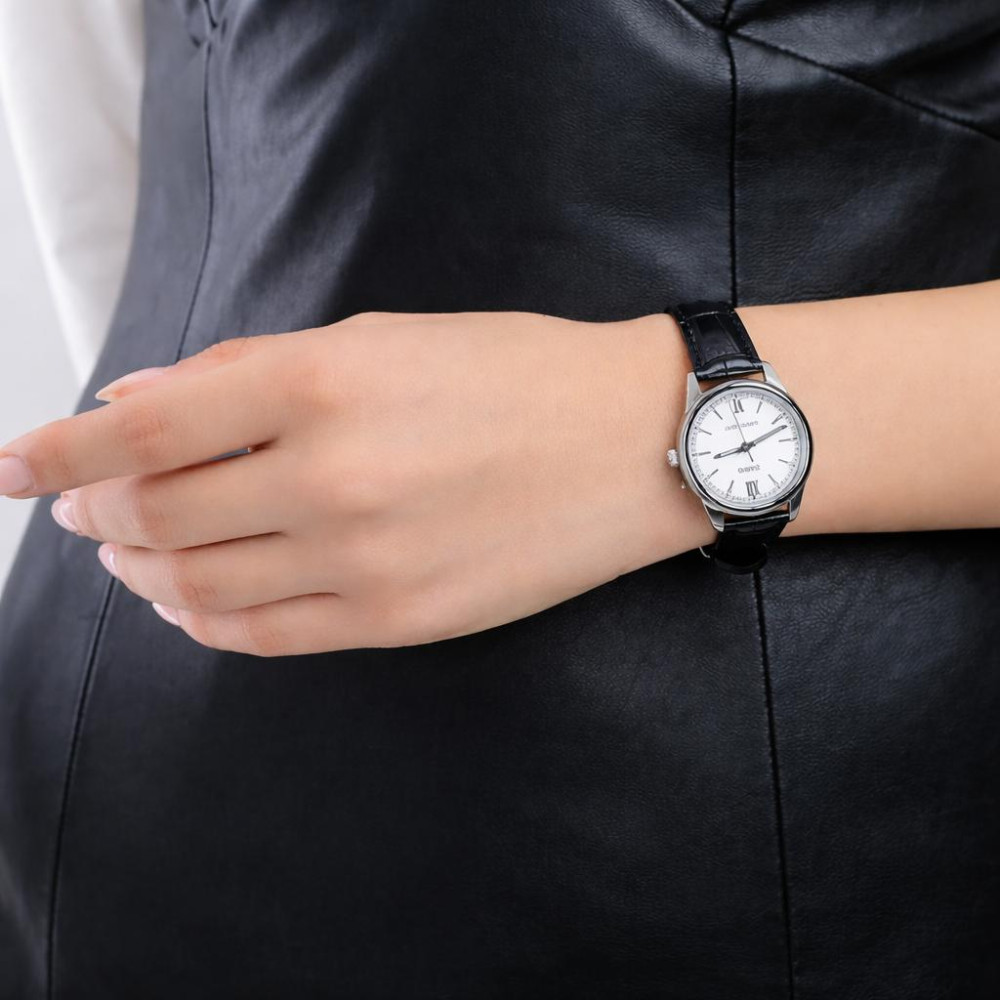 Casio LTP-V005L-7B2 оснащений надійним кварцовим механізмом, що забезпечує точність ходу та стабільну роботу протягом тривалого часу. Металевий корпус додає міцності конструкції, а зручний шкіряний ремінець гарантує комфортне носіння протягом усього дня. Світлий циферблат із чіткими контрастними мітками забезпечує легке зчитування часу та підкреслює класичний характер моделі. Завдяки компактним розмірам годинник акуратно виглядає на зап’ясті та не перевантажує образ зайвими деталями.