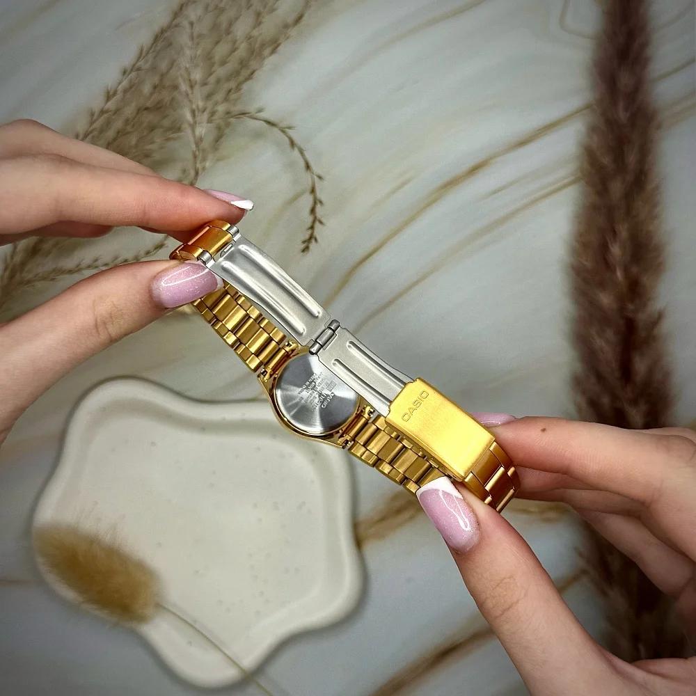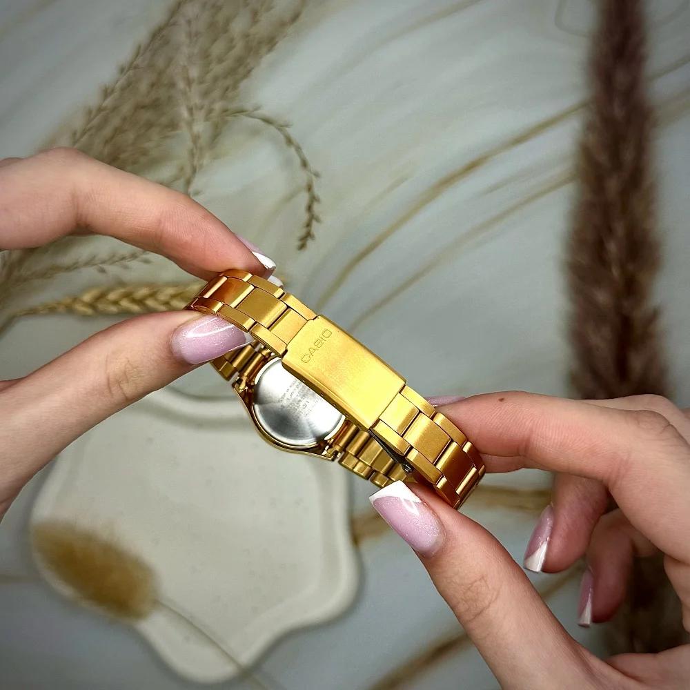 Представляємо жіночий годинник Casio LTP-1130N-7B — елегантний аксесуар, що поєднує в собі класичний стиль та сучасні технології. Цей годинник має круглий золотистий корпус діаметром 32 мм, виготовлений зі сталі, а також стильний браслет з того ж матеріалу. Мінімалістичний циферблат прикрашений індексами та арабськими цифрами, що надає моделі вишуканого вигляду.