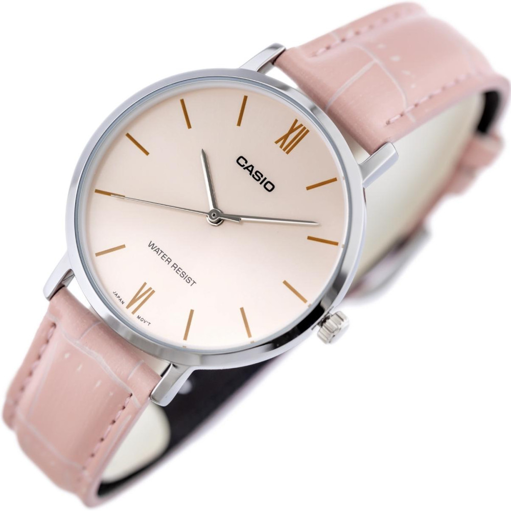 Представляємо жіночі годинники Casio LTP-VT01L-4B — елегантний аксесуар, який поєднує в собі класичний стиль та сучасні технології. Цей годинник виготовлений з високоякісних матеріалів: латунний корпус сріблястого кольору надійно ховає кварцевий механізм, а шкіряний рожевий ремінець додає нотки вишуканості.